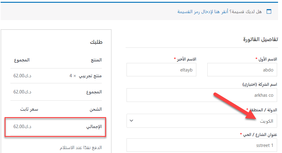 الأن عند اختيار الزبائن منطقة الشحن التي قمنا بتعيين الشحن المجاني عليها، سوف يظهر له إشعار الشحن المجاني داخل صفحة سلة المشتريات، ولن يتم تطبيق أي اسعار إضافية على سعر المنتجات: