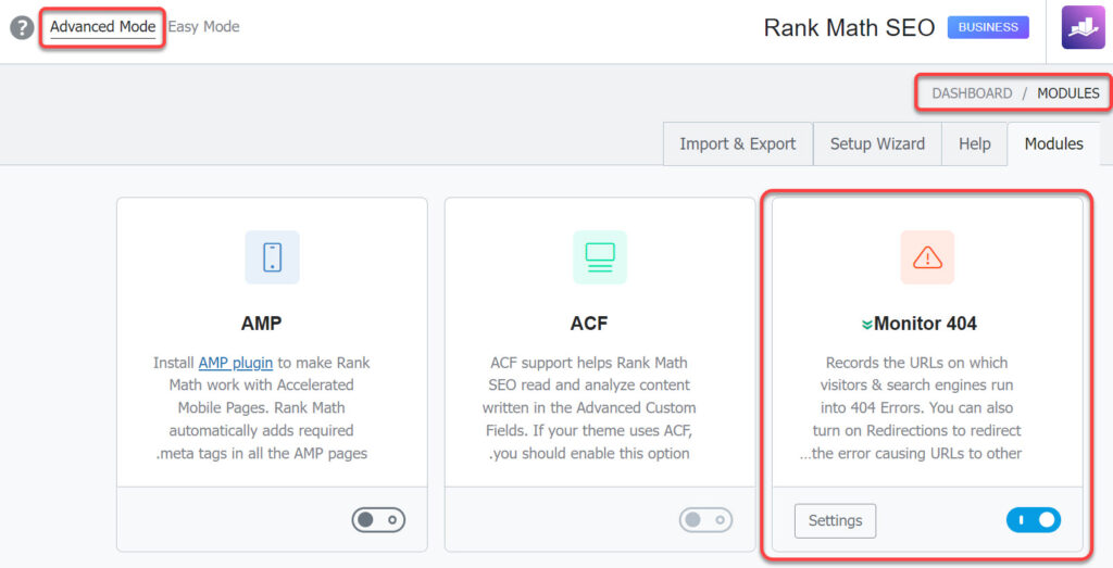 ملحوظة: إذا لم يظهر خيار تفعيل وحدة 404 Monitor، انتقل إلى الوضع المتقدم عن طريق النقر على (Advanced Mode) الموجودة في أعلى لوحة تحكم الإضافة (DASHBOARD / MODULES)، وسيظهر الخيار مباشرة ضمن الصفحة.