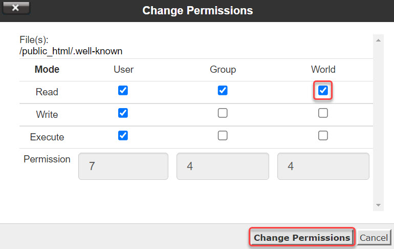 ستظهر لك نافذة تطلب منك ضبط أذونات الملف، تأكد من وجود إشارة صح في صف إذن القراءة (Read) ضمن عمود (World) إذا كنت تريد السماح للجميع بالوصول إلى الملف وقراءته، ثم انقر على زر (Change Permissions). لاحظ أن إذن القراءة لا يمكِّن المستخدمين والزوار من إجراء تعديلات على الملف، إنما يسمح لهم فقط بالاطلاع عليه.