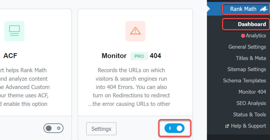 ومن أجل تفعيل وحدة 404 Monitor، انتقل إلى صفحة لوحة التحكم الخاصة بإضافة Rank Math SEO عن طريق النقر على خيار (Dashboard) من خيارات تبويب (Rank Math) في الواجهة الخلفية للووردبريس، ثم انقر على مفتاح التشغيل الخاص بـ 404 Monitor.