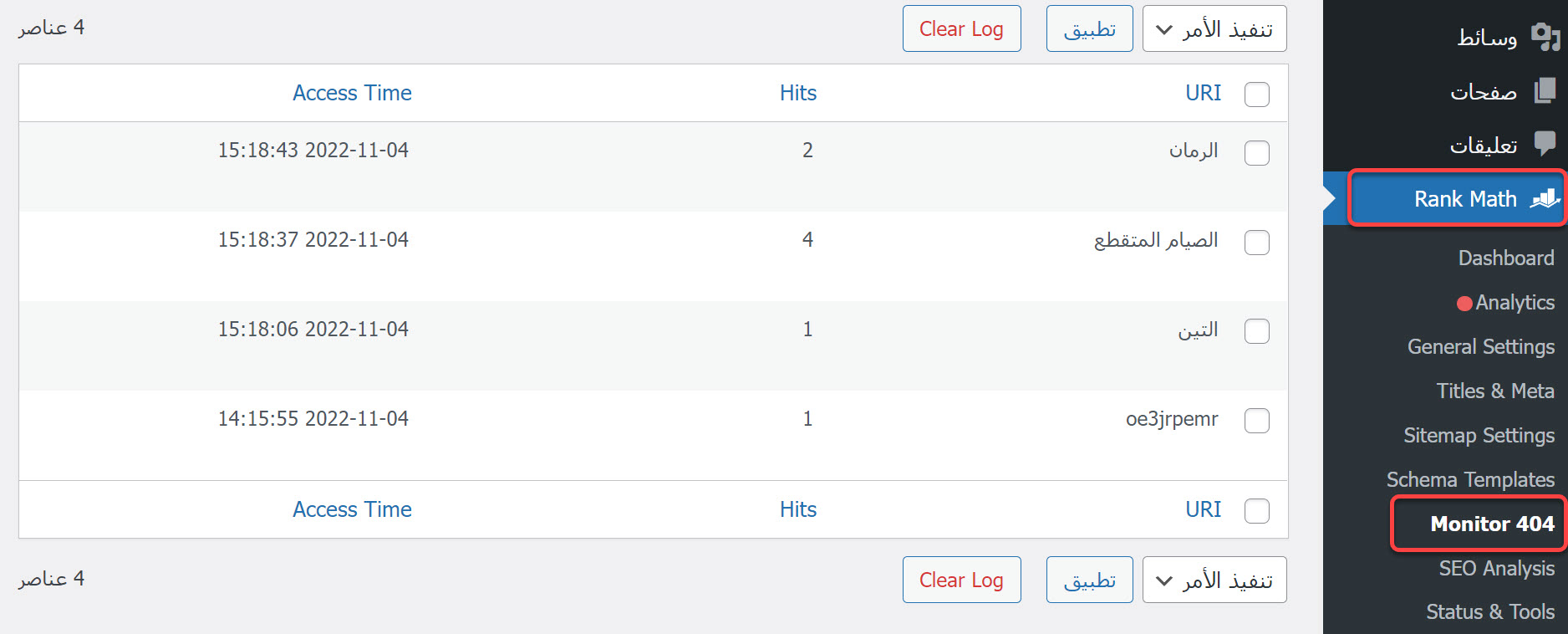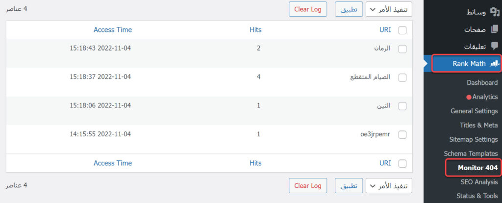 والآن بعد تفعيل وحدة 404 Monitor سيتم الاحتفاظ بجميع محاولات الوصول إلى المحتوى التي نتج عنها أخطاء 404 في الموقع الإلكتروني وإظهارها في صفحة Monitor 404 التي يمكن الوصول إلى إليها عبر النقر على خيار (Monitor 404) من تبويب (Rank Math).