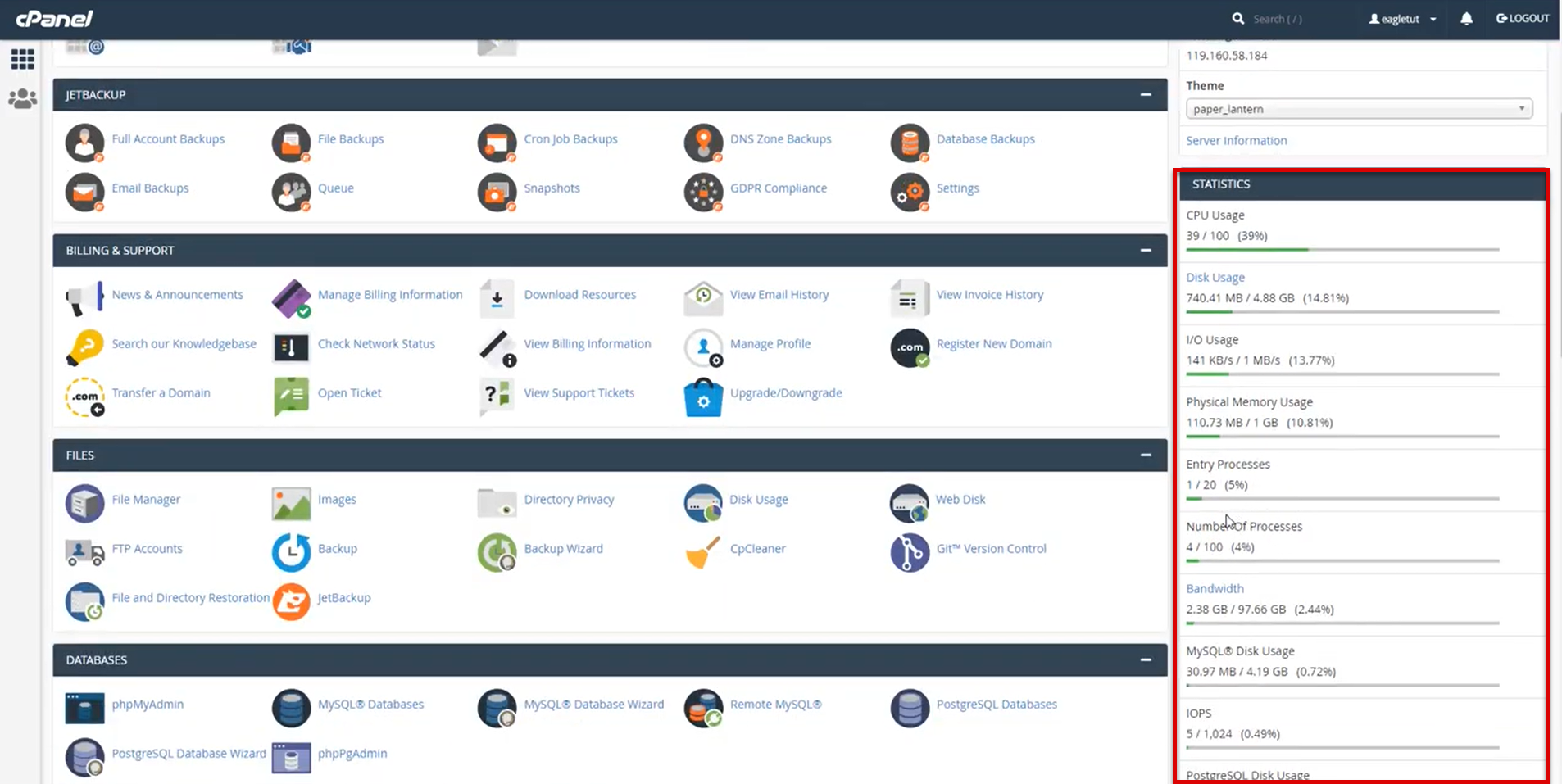 حيث تقوم بالدخول إلى الواجهة الرئيسية للوحة التحكم cPanel وبعد ذلك ستجد قائمة جانبية بعنوان Statics توضح حدود موارد الخادم ومعدل استهلاك موقعك وهي قائمة منسدلة فإذا كان مغلقة يمكن أن تضغط عليها لتظهر كافة المعلومات بها على سبيل المثال وحدة المعالجة المركزية CPU وذاكرة التخزين العشوائية Ram ومساحة التخزين Storage ومعدل نقل البيانات Bandwidth، وذلك كما موضح في الصورة التالية: