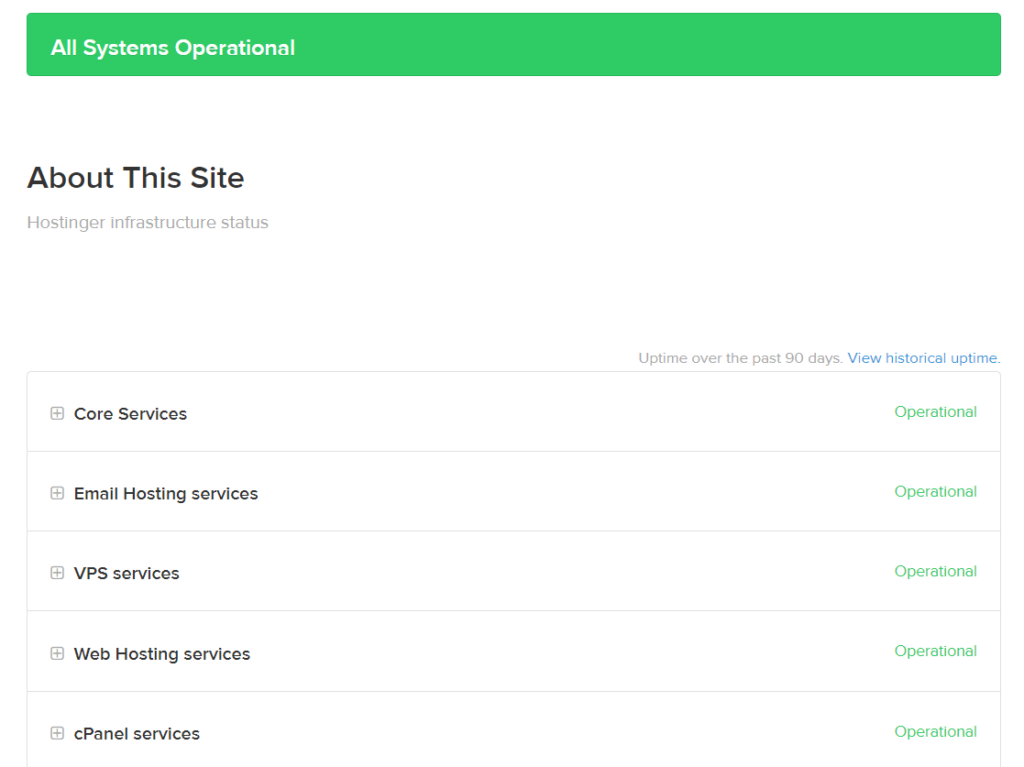 واغلب شركات الاستضافة الكبرى تقدم رابط مباشر يوضح حالة خوادمها بشكل لحظي على مدار اليوم فتستطيع الدخول إلى هذا الرابط والتأكد من حالة الخادم على سبيل المثال الصورة التالية توضح حالة الخدم لإحدى شركات الاستضافة في وقت كتابة المقال: