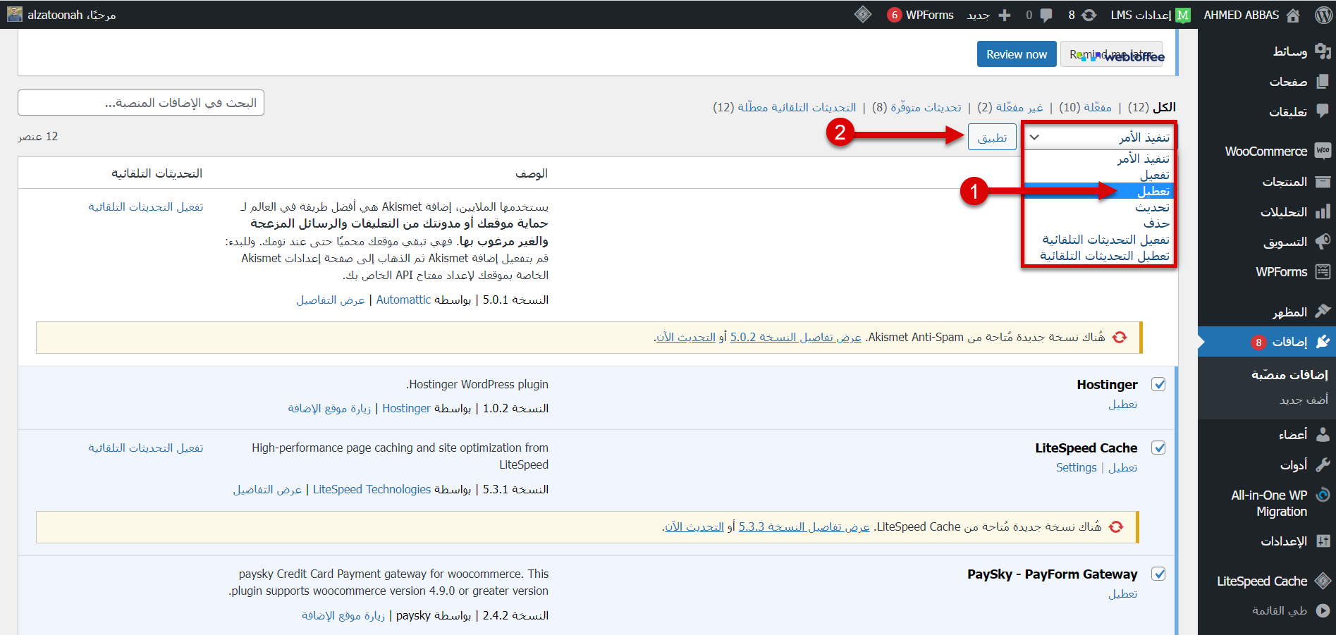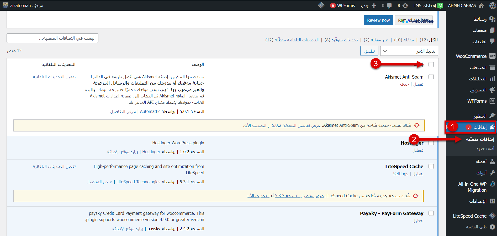بعد ذلك سيظهر لك جميع الإضافات المنصبة على موقعك الووردبريس، فتقوم بتحديد جميع الإضافات عن طريق تحديد المربع العلوي للتحديد كما موضح في الصورة التالية: