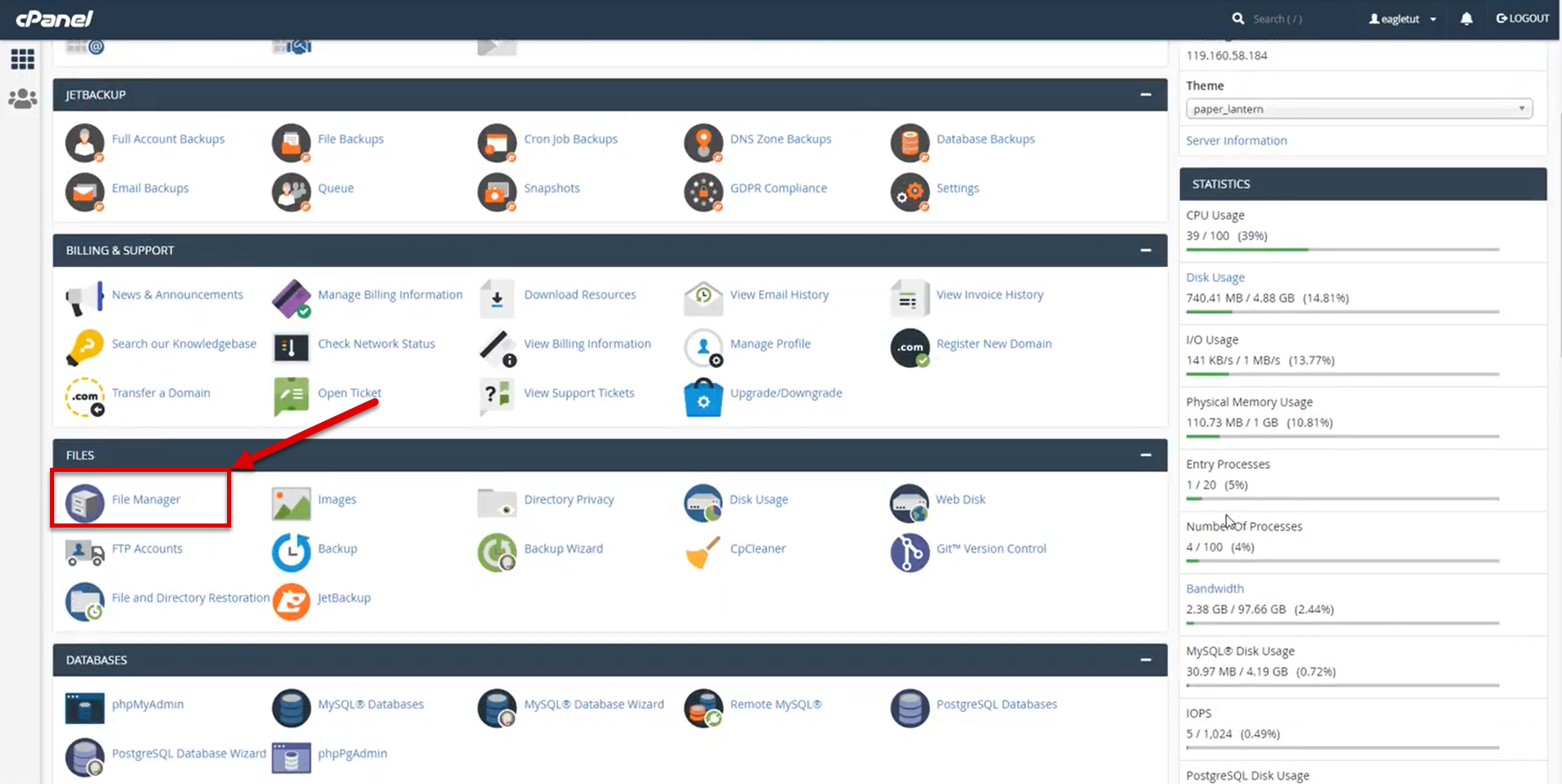 ولكن إذا لم تستطيع الدخول إلى لوحة تحكم موقعك بسبب خطأ 503 Service Unavailable هنا يجب محاولة إيقاف إضافات الموقع الإلكتروني من لوحة التحكم الرئيسية على سبيل المثال لوحة cPanel، حيث تقوم بالدخول إلى لوحة تحكم cPanel الرئيسية وتختار منها File Manager من قائمة File كما موضح في الصورة التالية: