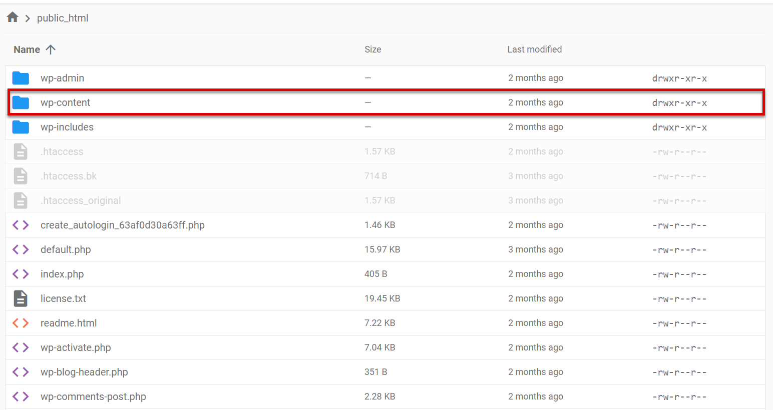 وبعد ذلك تقوم البحث عن مجلد wp-content وتقوم بالدخول إلى محتوياته كما موضح في الصورة التالية: