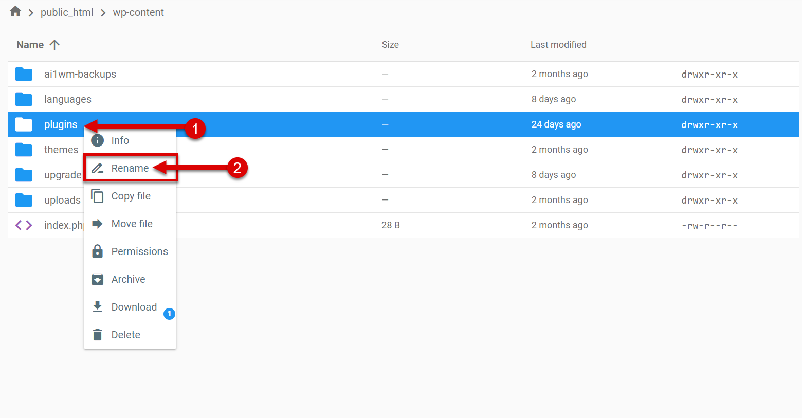بعد ذلك تقوم بالبحث عن مجلد plugins وهو الملف المسئول عن إضافات موقعك الإلكتروني، فتقوم باعادة تسمية الملف باسم plugins.old وذلك عن طريق الضغط على الزر الأيمن على المجلد واختيار Rename ثم كتابة الاسم الجديد وذلك كما موضح في الصورة التالية:
