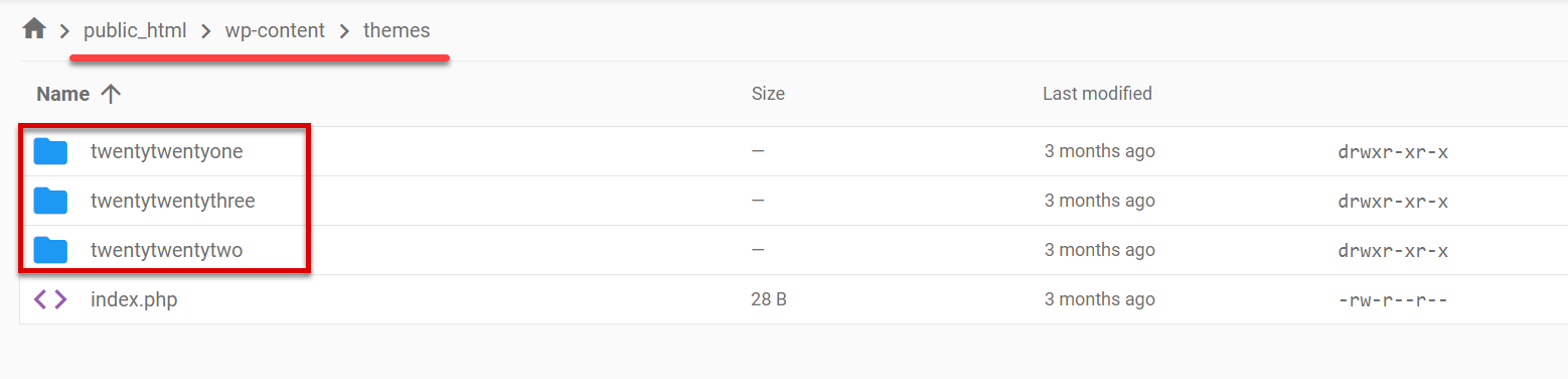 فتقوم بالدخول إلى لوحة التحكم cPanel الرئيسية وبعد ذلك تختار أمر File Manager من قائمة File لعرض ملفات موقعك الإلكتروني مرة أخرى، ثم تقوم بالبحث عن ملف wp-content وبعد ذلك تبحث عن ملف themes المسئول عن عرض جميع القوالب في موقعك الإلكتروني، فتقوم بتحديد القالب الرئيسي المنصب على موقعك الووردبريس كما موضح في الصورة التالية: