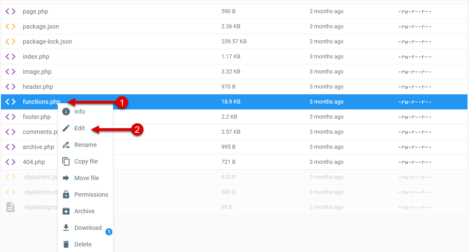 بعد ذلك تقوم بالدخول إلى القالب الرئيسي المنصب على موقعك على سبيل المثال قالب twentytwentyone، ثم نقوم بالبحث عن ملف functions.php ثم تضغط على الزر الأيمن وتختار Edit كما موضح في الصورة التالية: