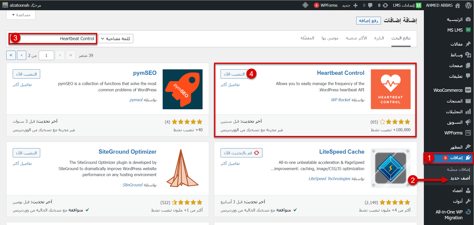 فتقوم بالدخول إلى لوحة الووردبريس الرئيسية وبعد ذلك تختار إضافات من القائمة الجانبية ومنها تختار أضف جديد ثم تأتي في خانة البحث وتبحث عن اضافة Heartbeat Control وذلك كما موضح في الصورة التالية: