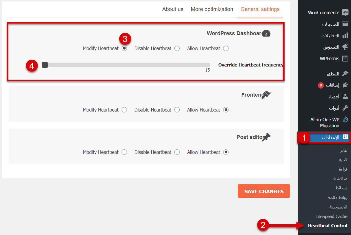 ستظهر لك صفحة إعدادات Heartbeat Control تختار من القائمة العلوية General Settings وبعد ذلك تنزل إلى خيار WordPress Dashboard وتختار خيار Modify Heartbeat وتقوم بتقليل المؤشر من 300 إلى 15 كما موضح في الصورة التالية: