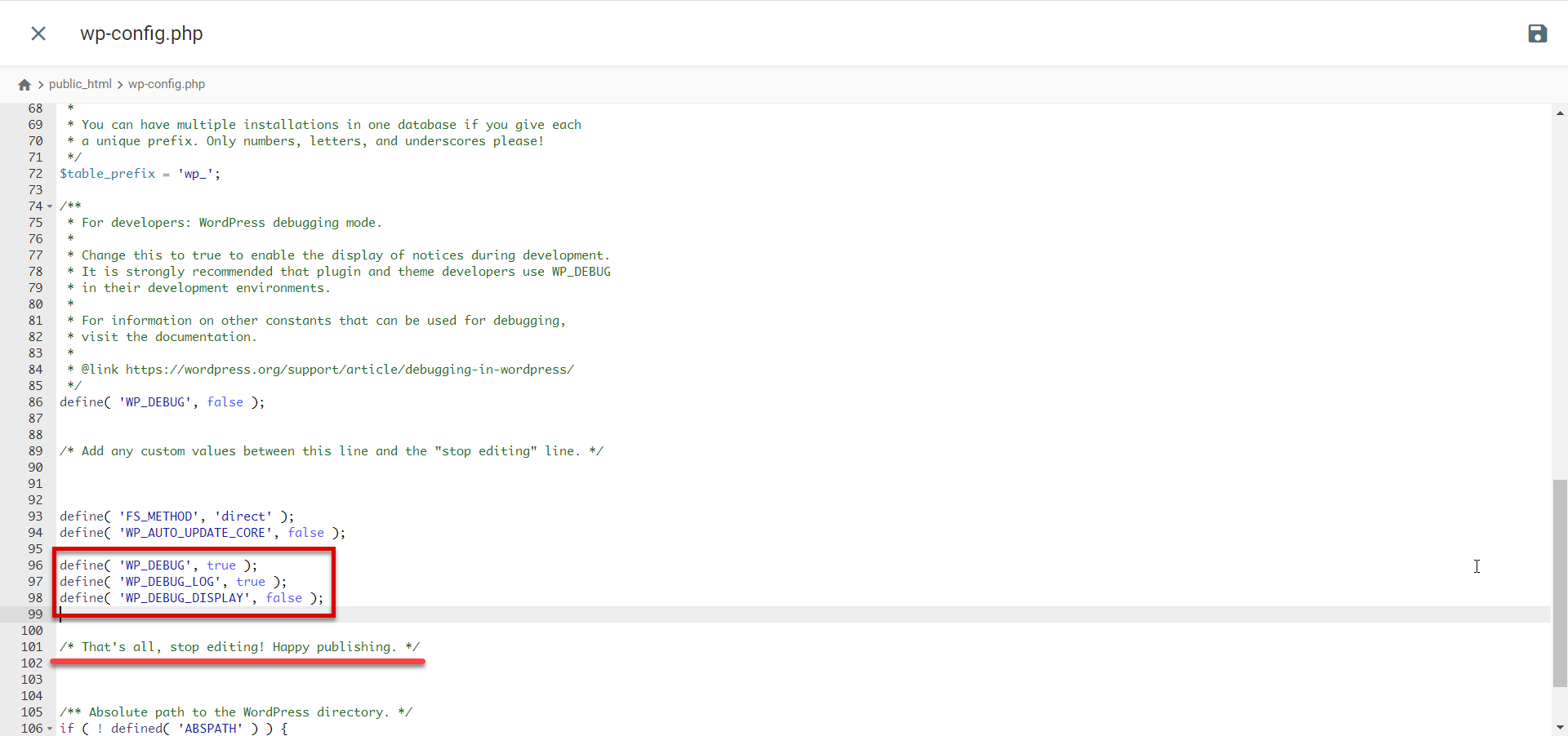 الخطوة الأخيرة هي تمكين وضع التصحيح WP_DEBUG في الووردبريس، هي أن وضع التصحيح WP_DEBUG في الووردبريس هو عبارة عن مجموعة من الأدوات تساعد على تشخيص المشاكل وتحديد الأسباب الجذرية بشكل دقيق، لذلك ستقوم بتفعيل وضع التصحيح حتى تقوم بتركيز مجهودك في إتجاه محدد.