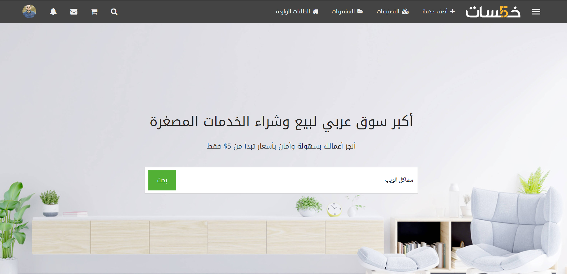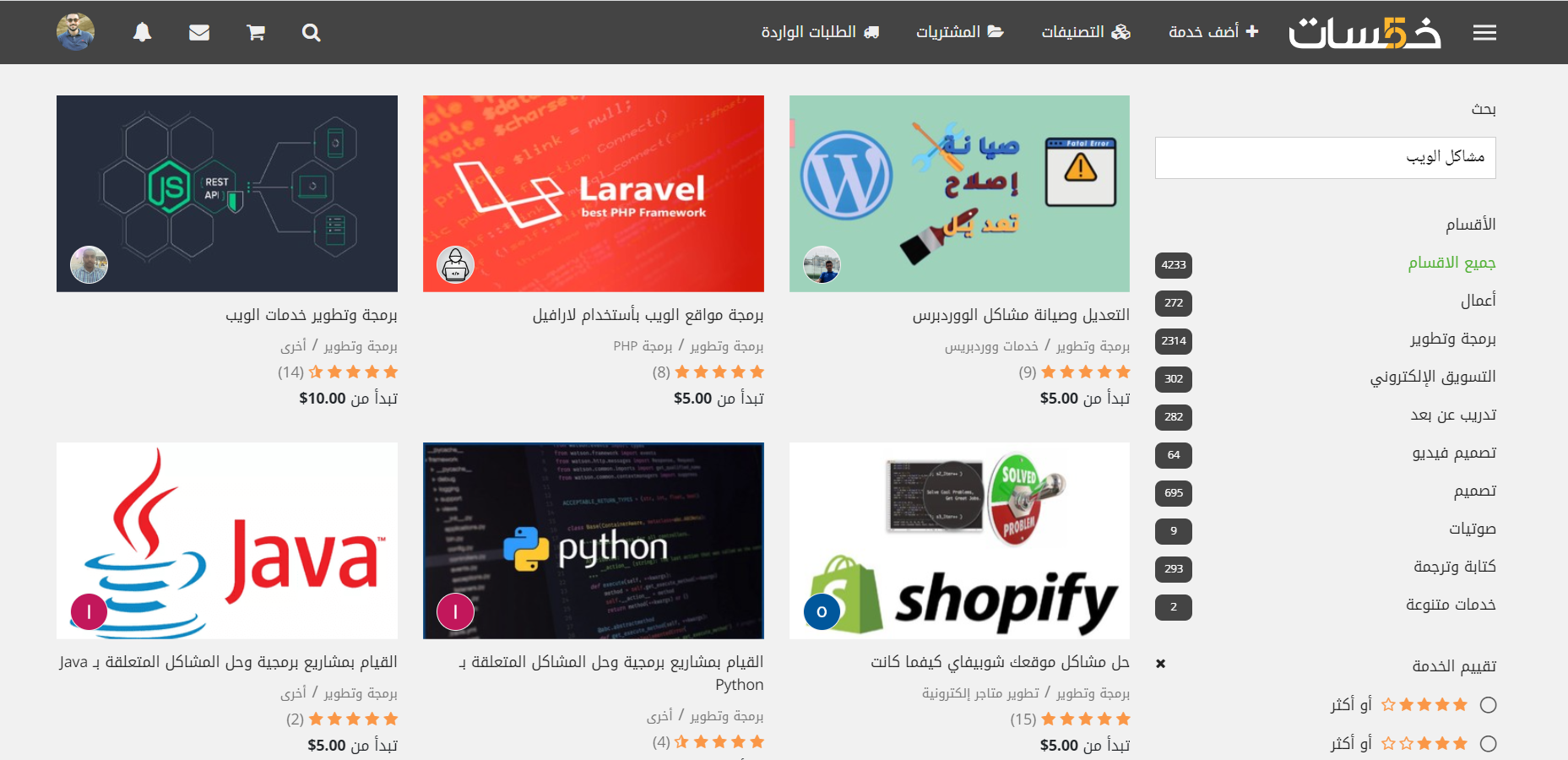 حيث تقوم بالدخول إلى منصة خمسات ثم تأتي إلى خانة البحث في الواجهة الرئيسية وتقوم بالبحث بكلمة مفتاحية مرتبطة بالتخصص المطلوب على سبيل المثال مشاكل الويب كما موضح في الصورة التالية: