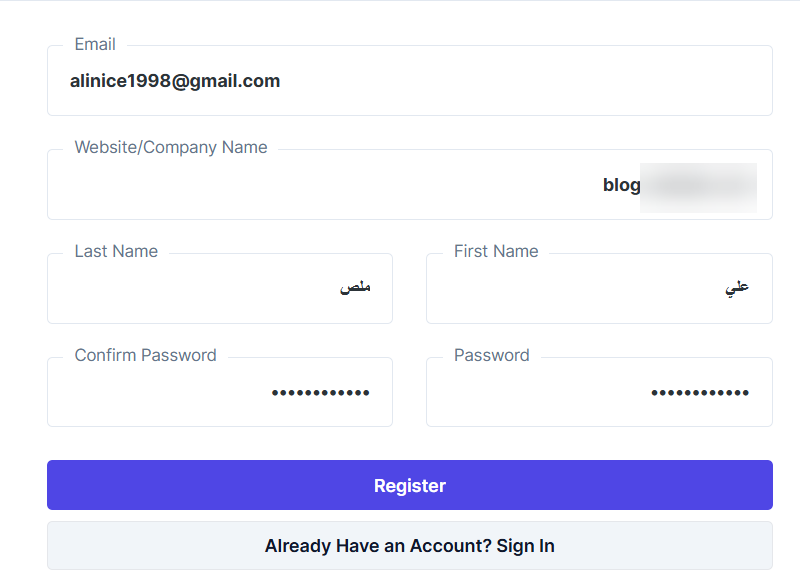 بعد ذلك أدخل بياناتي لإنشاء حساب في النموذج الذي يظهر، وأنقر على زر Register.