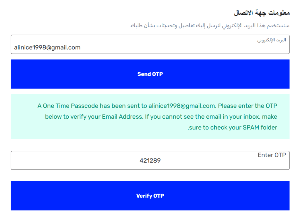 وبهذا يظهر زر Send OTP أسفل حقل البريد الإلكتروني في صفحة الدفع، وعند النقر عليه تظهر رسالة توضح أنه تم إرسال رمز إلى البريد الإلكتروني، حيث يجب على العميل أن يدخل الرمز الذي وصله في حقل Enter OTP الذي يظهر بعد إرسال الرمز.