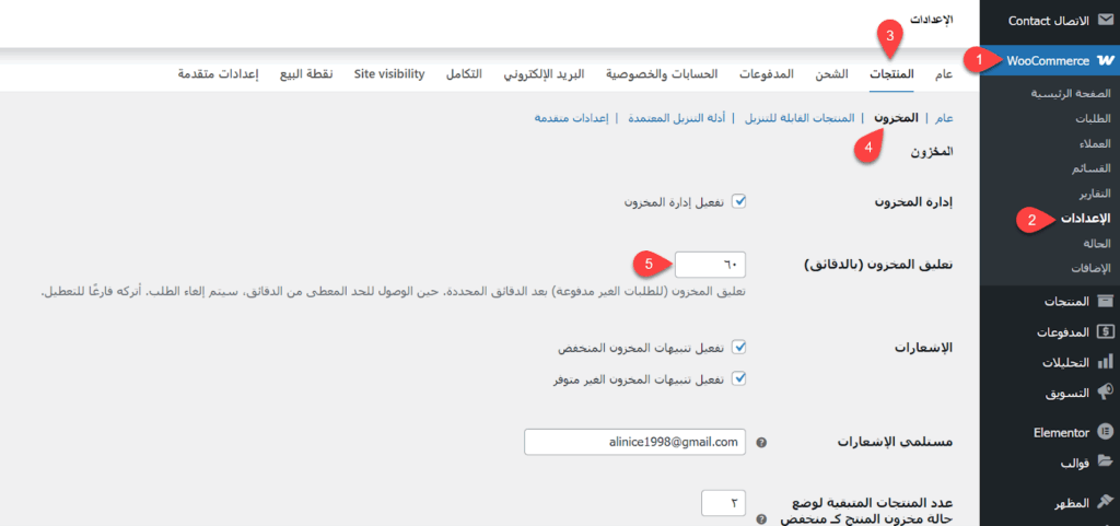لحل هذه المشكلة، ليس هناك حاجة لاستخدام كود أو إضافة، إنما أستخدم إعدادًا بسيطًا يوفره ووكومرس ويغفل عنه الكثيرون، حيث أنتقل إلى WooCommerce > الإعدادات > المنتجات > المخزون، وأحدد عدد الدقائق التي ستحتجِز فيها الطلبات غير المدفوعة الكمية المحددة فيها من المخزون.
