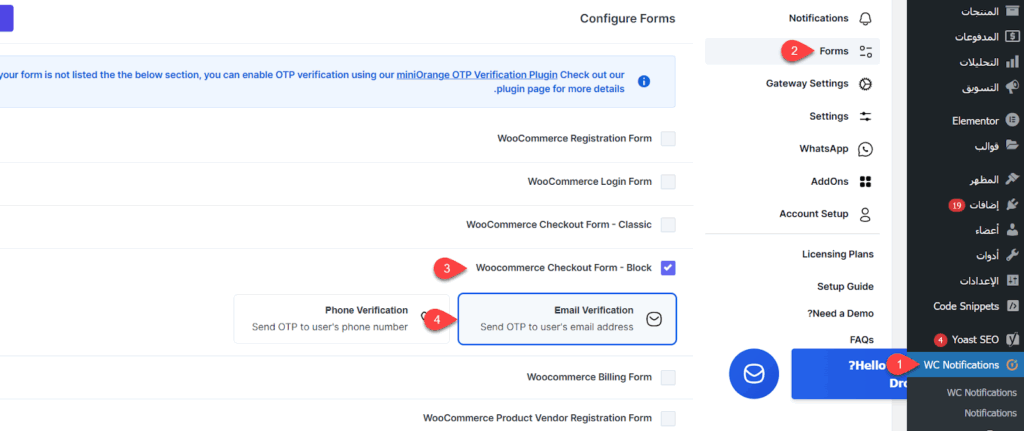ثم أنتقل إلى WC Notifications ثم Forms ثم أفعل خيار WooCommerce Checkout Form وأختار Email Verification.