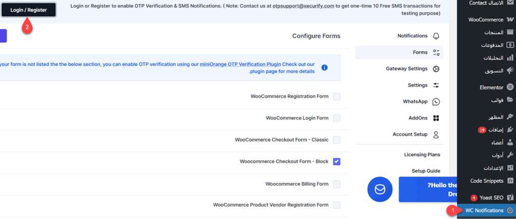 وللتفعيل بعد تنصيب الإضافة أنتقل إلى WC Notifications ثم أنقر على زر Login / Register.