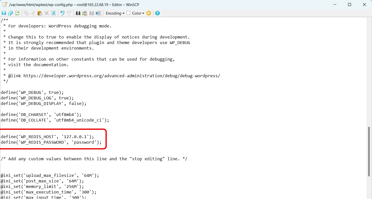 إضافة كود الاتصال بـ Redis في ملف wp-config.php