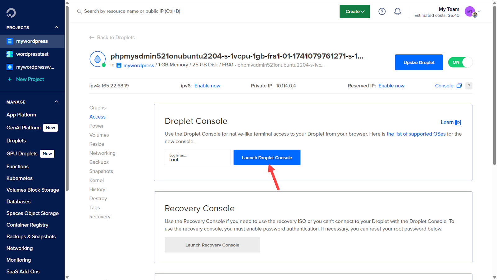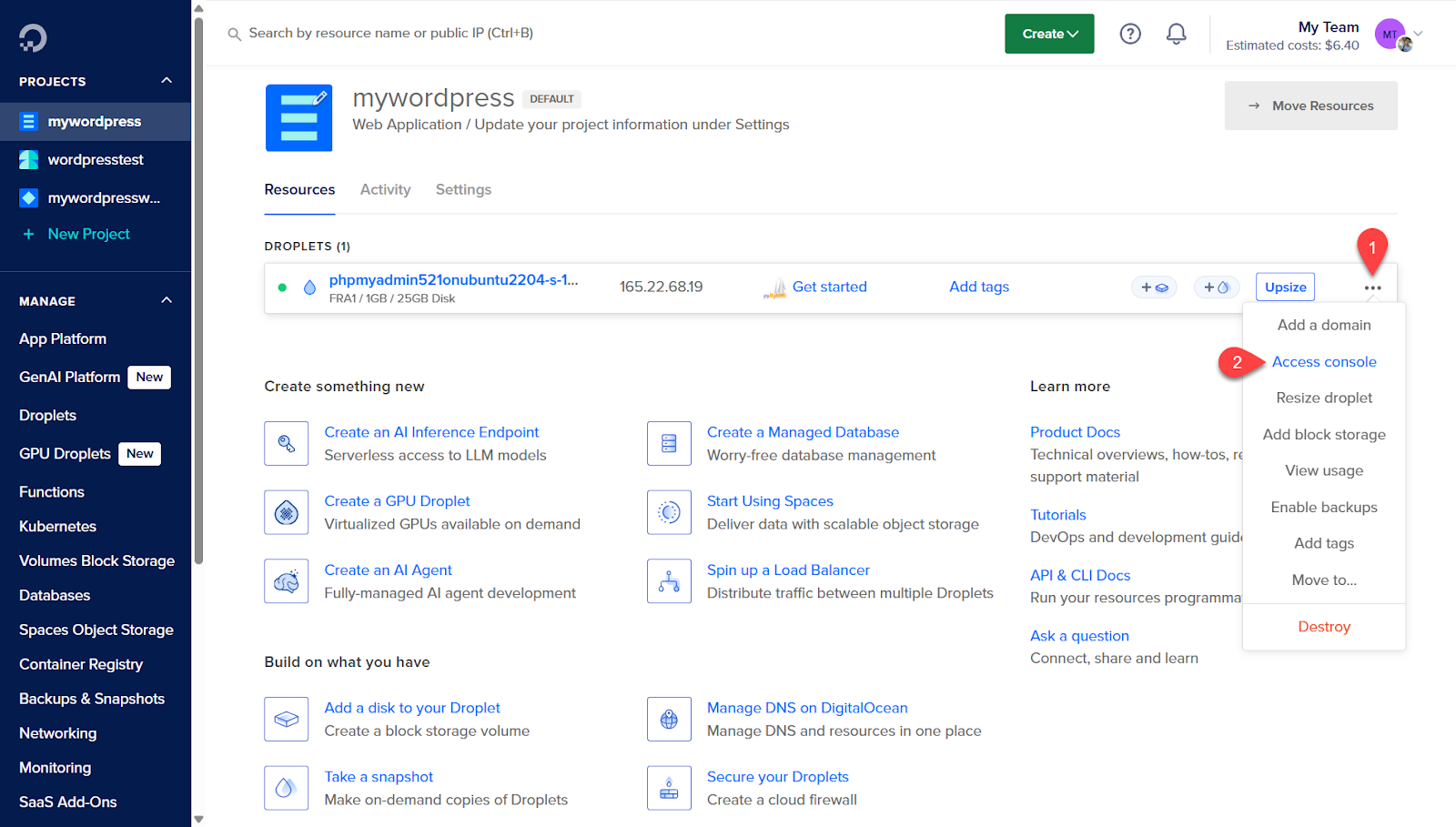 في لوحة تحكم ديجيتال أوشن، نقرت على خيارات الاستضافة، ثم على Access console للوصول إلى سطر الأوامر.