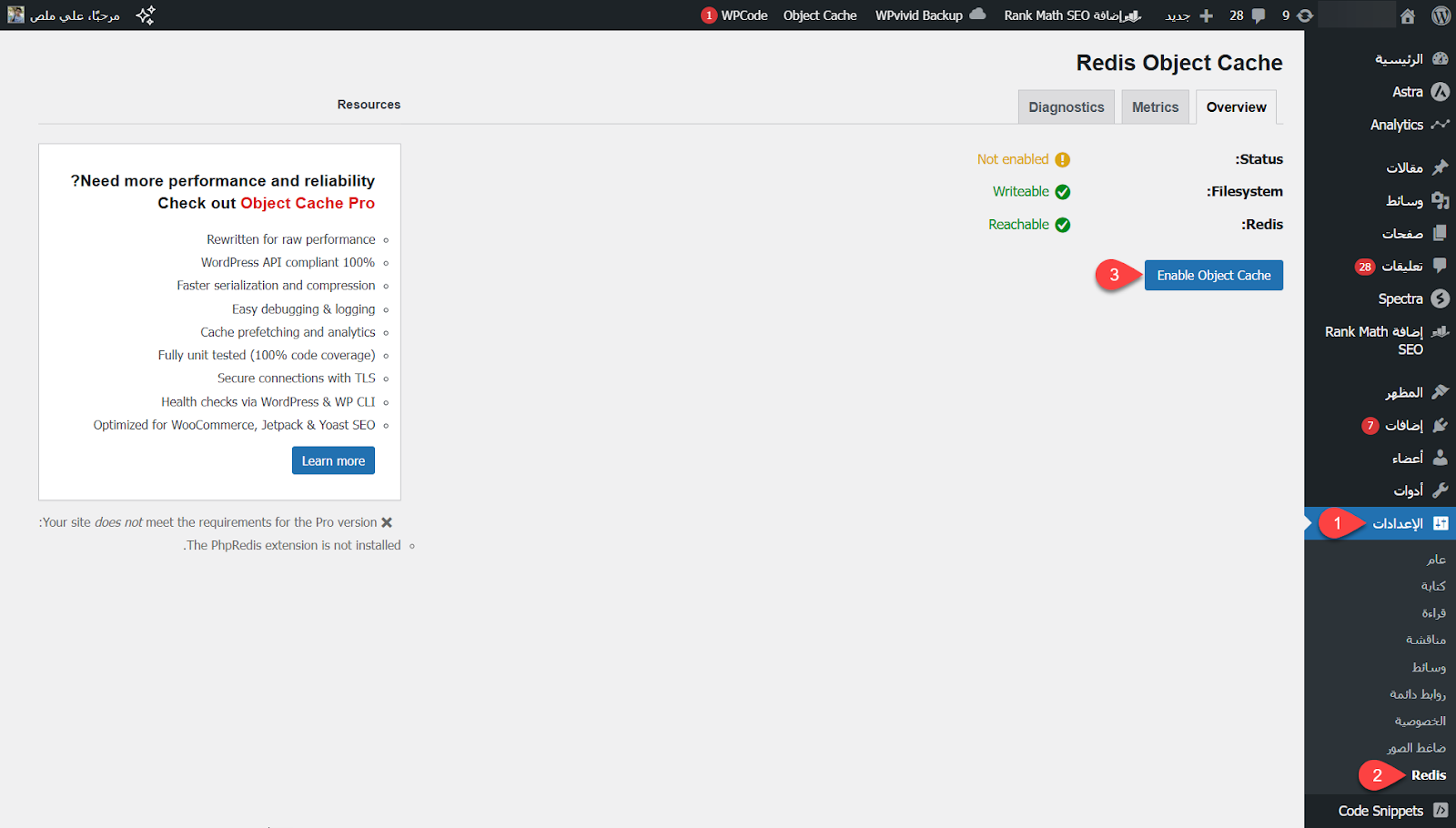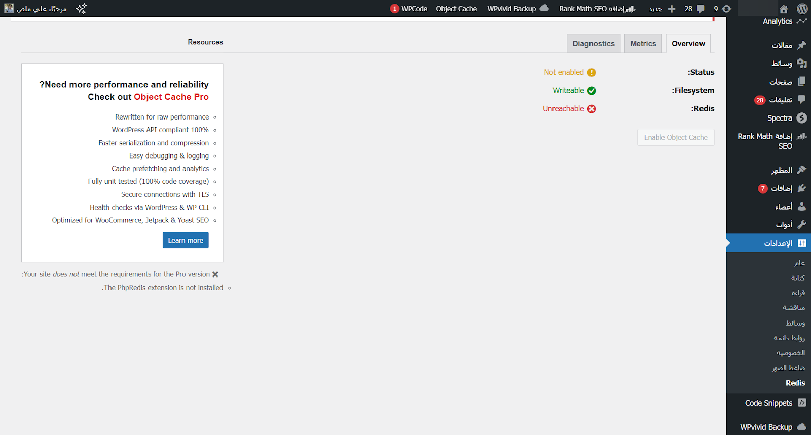 بعد تنصيب إضافة Redis Object Cache والانتقال إلى الإعدادات > Redis، قد تلاحظ عدم تفعيل زر Enable Object Cache للاتصال بـ Redis بالرغم من أن نظام Redis منصب على الخادم.