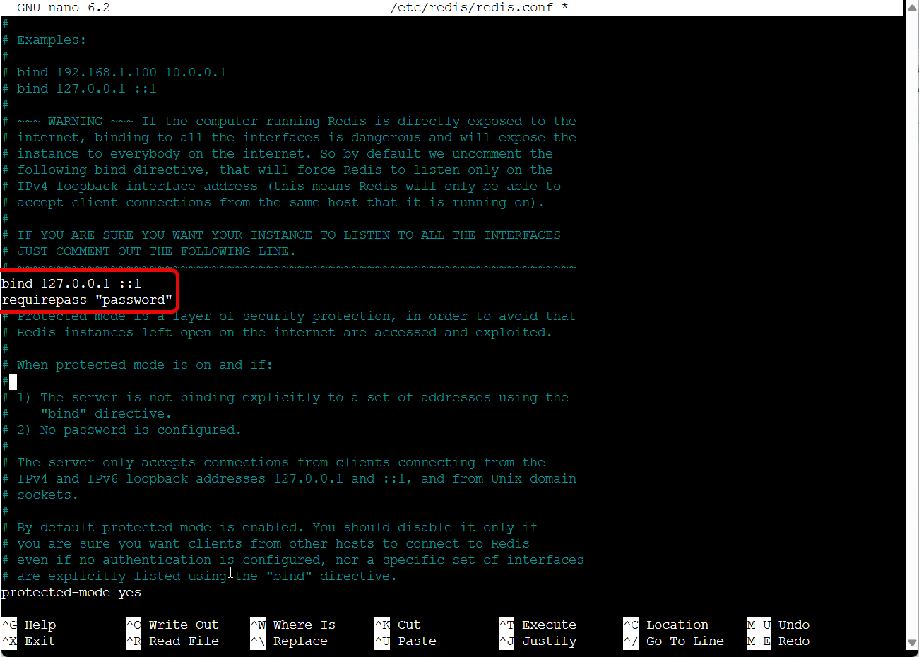 حيث وضعت مكان password في نهاية السطر الثاني، كلمة المرور نفسها التي وضعتها في ملف redis.conf عند تأمين Redis.