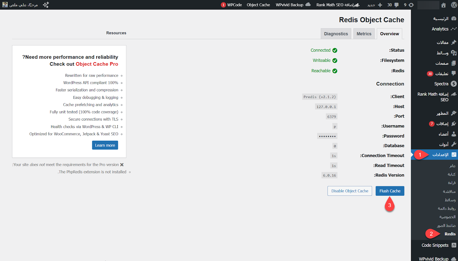 نصبت إضافة Redis Object Cache بنفس الطريقة المشروحة في مقال (تنصيب إضافات الووردبريس المجانية والمدفوعة)، ثم انتقلت إلى الإعدادات > Redis، ونقرت على زر Enable Object Cache.