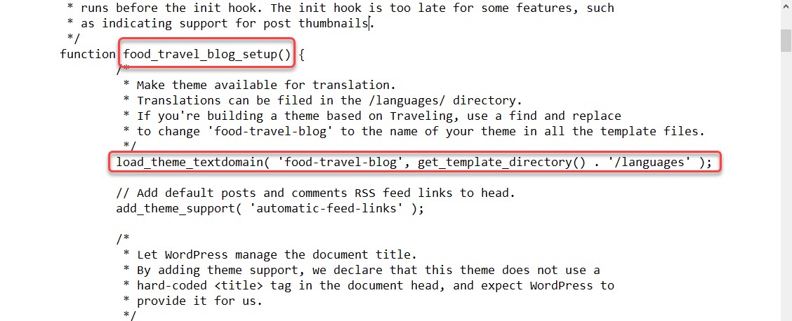 والآن إذا لم يكن قد تم تخزين ملف الترجمة وملف POT ضمن مجلد languages، قم بنقلهم إلى هذا المجلد كما أشرنا سابقًا، ثم أدرج دالة load_theme_textdomain الموجودة في الكود التالي ضمن ملف وظائف القالب (functions.php) داخل دالة food_travel_blog_setup: