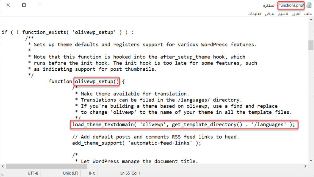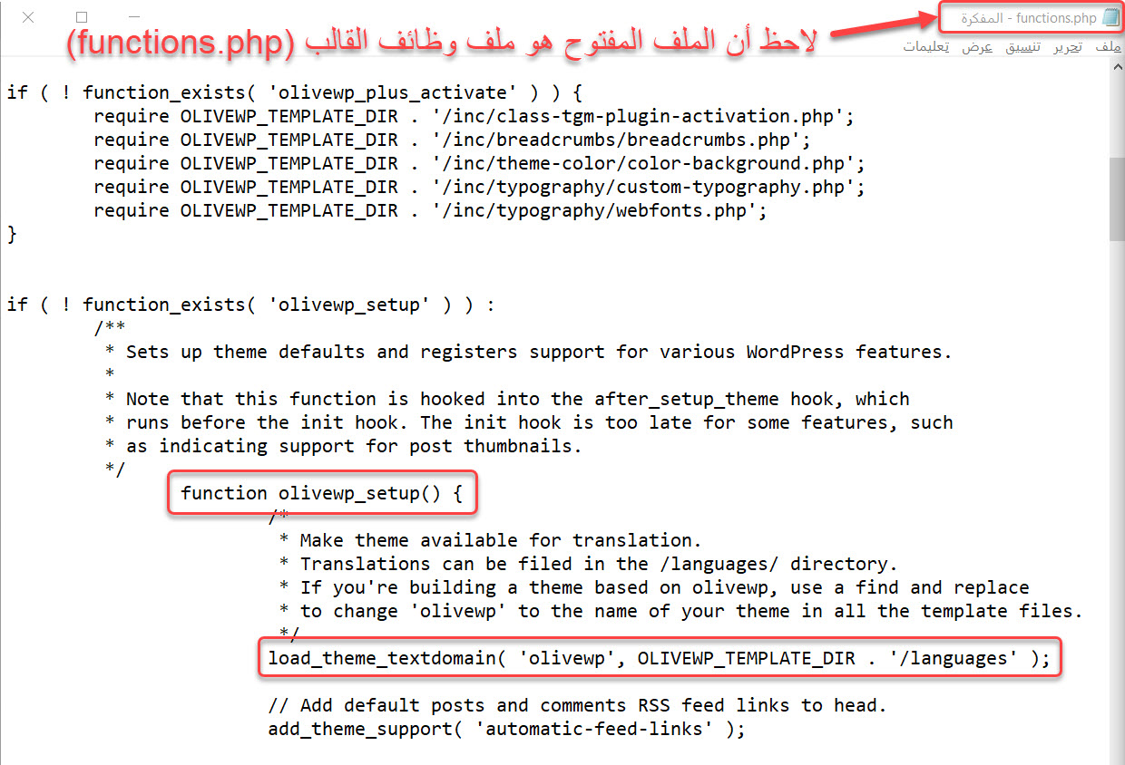 الأمر الثاني: احتواء ملف functions.php على وظيفة load_theme_textdomain