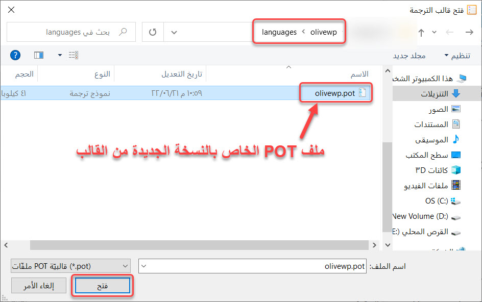 ستظهر لك نافذة تطلب منك اختيار ملف POT. عليك أن تختار ملف POT الخاص بالنسخة الجديدة من قالب الووردبريس، والذي ستجده في مجلد (languages) ضمن ملفات النسخة الجديدة من القالب بعد تنزيلها وفك الضغط عنها. وبعد اختيار الملف عليك النقر على زر (فتح).