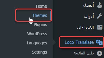 بعد ذلك قم بتنصيب القالب على موقعك الإلكتروني من خلال الواجهة الخلفية بإحدى الطرق الموضحة في مقالتنا (شرح طريقة تنصيب قوالب ووردبريس)، ثم ضع مؤشر الفأرة على خيار (Loco Translate) في القائمة الجانبية للواجهة الخلفية في الووردبريس، ثم انقر على خيار (Themes).