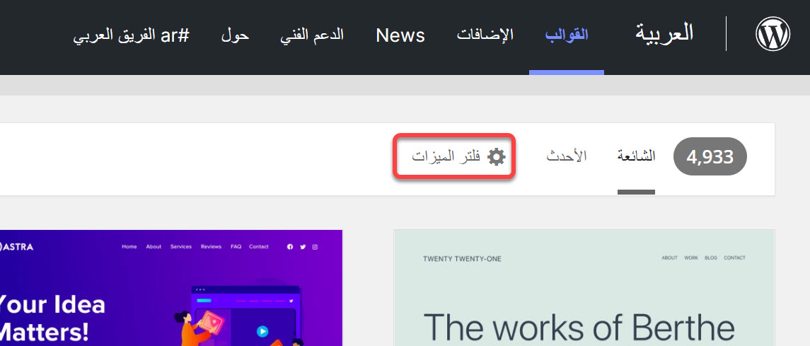 للحصول على قالب ووردبريس مجاني جاهز للترجمة من متجر قوالب الووردبريس الرسمي، قم بالذهاب إلى المتجر عبر النقر على هذه العبارة (متجر قوالب ووردبريس الرسمي)، ثم انقر على أيقونة (فلتر الميزات).