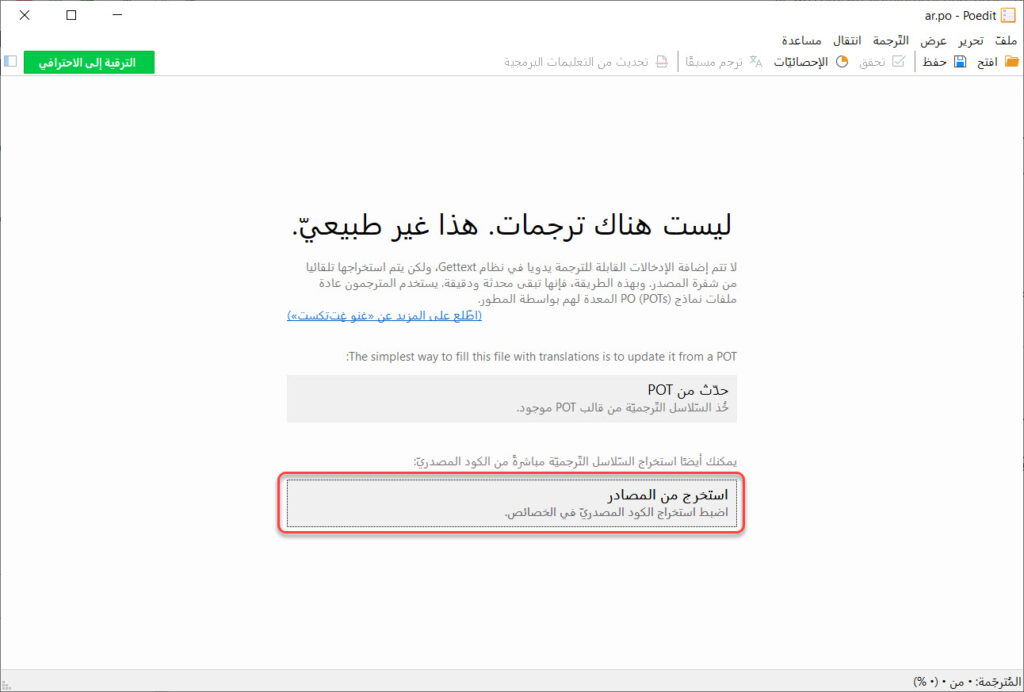 بعد التأكد من أن المطور قد وضع عبارات القالب ضمن دوال الترجمة، افتح برنامج POEdit، ثم أنشئ ترجمة جديدة عبر النقر على كلمة (جديد) من قائمة (ملف) أو عبر الضغط على زري Ctrl و N من لوحة المفاتيح، ثم احفظ الملف عبر النقر على خيار (حفظ) من قائمة (ملف) وتحديد مكان الحفظ في مجلد languages الخاص بالقالب، ثم انقر على (استخرج من المصادر).