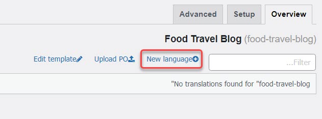 سيتم مباشرة إنشاء ملف POT للقالب، ونقلك إلى صفحة إدارة ترجمات القالب. لبدء تعريب قالب الووردبريس، انقر على (New language).
