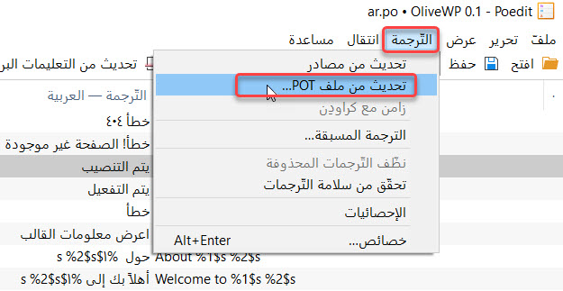 لفعل ذلك، حمل النسخة الجديدة من القالب وقم بفك ضغطها على جهاز الكمبيوتر الخاص بك، ثم افتح ملف الترجمة الخاص بالنسخة القديمة (ar.po) باستخدام برنامج POEdit، ثم انقر على خيار (الترجمة) من القائمة الأفقية العلوية، ثم اختر (تحديث من ملف POT...).