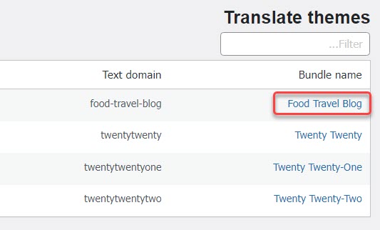 ستظهر لك صفحة يمكنك من خلال اختيارها تحديد القالب الذي تريد ترجمته من قوالب الووردبريس المنصبة لديك. اختر القالب الذي تريد ترجمته (في حالتنا Food Travel Blog) عن طريق النقر على اسمه.