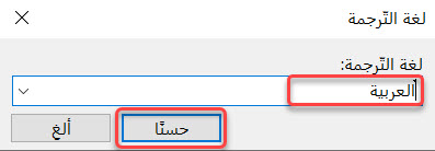 سيقوم البرنامج الآن بإظهار مربع يطلب منك تحديد اللغة التي تريد ترجمة قالب الووردبريس إليها، وبما أننا نقوم هنا بتعريب القالب، فسنختار اللغة العربية من القائمة المنسدلة (يمكنك أيضًا كتابة رمز اللغة العربية بدلًا من اختيارها من القائمة وهو ar). وبعد تحديد اللغة، انقر على زر (حسنًا).