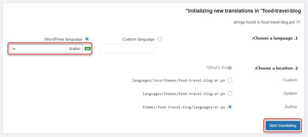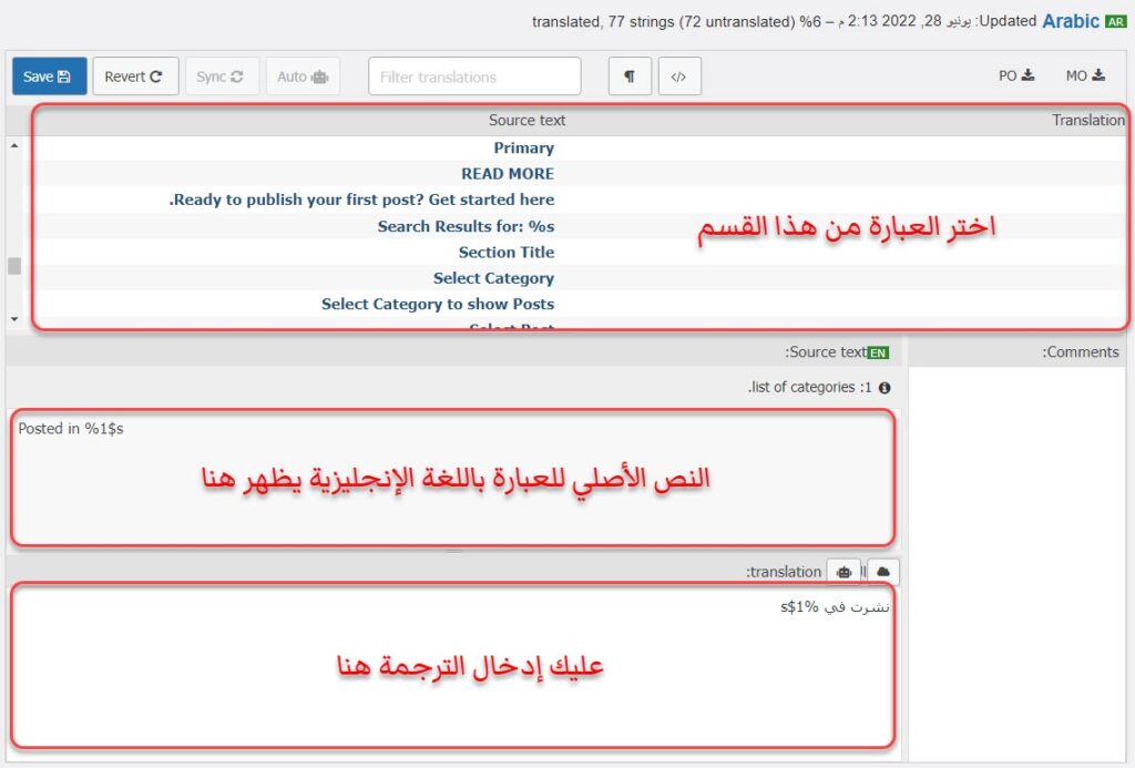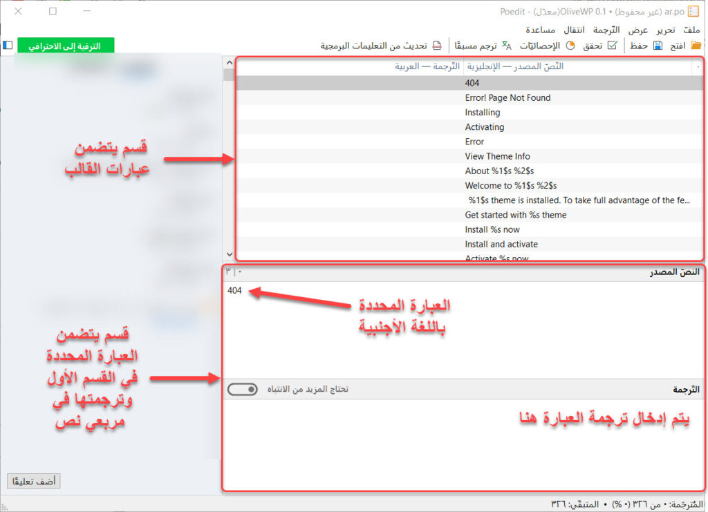 - ترجمة عبارات القالب إلى اللغة العربية. يمكن فعل ذلك باستخدام برنامج POEdit، لكننا سنشرح هنا كيفية فعل ذلك باستخدام إضافة Loco Translate.