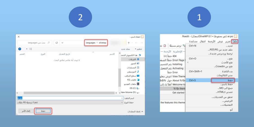 بعد أن تنتهي من ترجمة جميع عبارات قالب الووردبريس، قم بإنشاء ملفي po و mo لتلك الترجمة في نفس مجلد ملف POT الخاص بالقالب من خلال النقر على خيار (ملف) من الشريط الأفقي العلوي، ثم اختيار (حفظ). ثم تحديد نفس مسار المجلد الذي يحتوي ملف POT (مجلد languages الخاص بالقالب)، ثم النقر على زر حفظ في مربع حفظ باسم الذي يظهر.