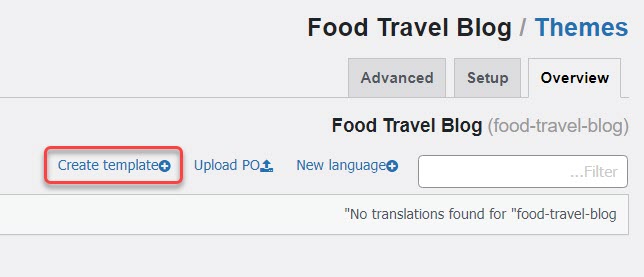 سيتم فتح صفحة إدارة ترجمات القالب، وبما أن القالب لا يتضمن ملف POT اللازم للترجمة، علينا إنشاء واحد. لفعل ذلك، انقر على زر (Create template).