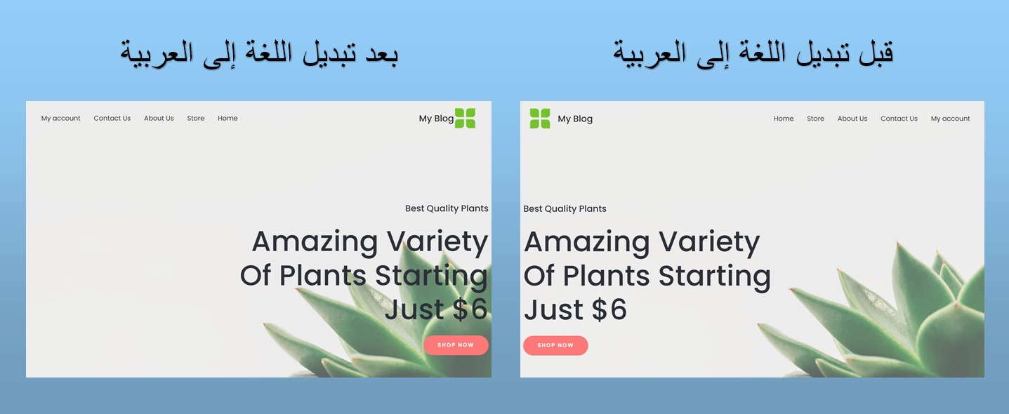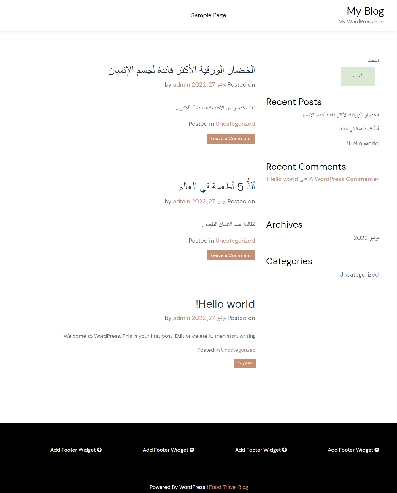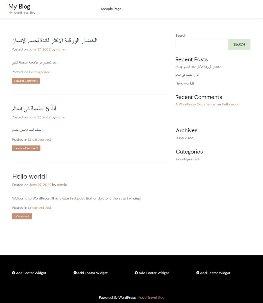 قمنا بتغيير لغة الموقع إلى العربية من خلال الواجهة الخلفية في الووردبريس، فتغيرت اتجاهات بعض العناصر في الموقع لتصبح من اليمين إلى اليسار، لكن العديد من العناصر الأخرى لا زالت بالاتجاه من اليسار إلى اليمين، كما لم يتم ترجمة عبارات القالب إلى العربية.