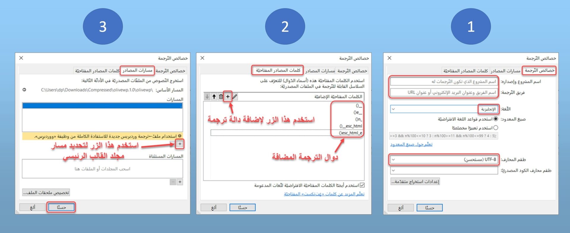 ستظهر لك نافذة تتضمن مجموعة من علامات التبويب. تتضمن علامة التبويب الأولى (خصائص الترجمة)، عليك تحديد لغة القالب الأصلية وباقي الخصائص التي تريدها، ثم تنتقل إلى علامة التبويب الثالثة (كلمات المصادر المفتاحية) وتدخل الدوال المستخدمة لتغليف العبارات النصية في ملفات القالب، ثم عليك الانتقال إلى علامة التبويب الثانية (مسارات المصادر)، وتحدد المجلد الرئيسي الذي يحتوي على ملفات القالب، وبعد ذلك عليك النقر على زر (حسنًا).