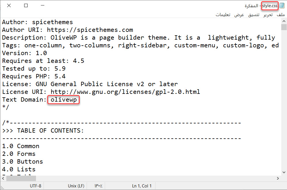 نود أن نشير أيضًا إلى أن الـ Text Domain لقالب الووردبريس المنشور في الموقع الرسمي للبرنامج يكون مذكورًا في رابط القالب بعد (themes)، فمثلًا الـ Text Domain للقالب ذو الرابط (https://ar.wordpress.org/themes/olivewp) هو (olivewp).