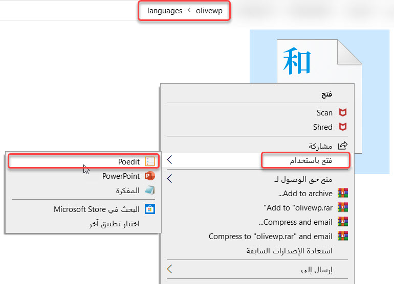 افتح ملف POT الموجود في مجلد (languages) الخاص بالقالب الذي تريد تعريبه باستخدام برنامج POEdit من خلال النقر على الملف مرتين متتاليتين بزر الفأرة الأيسر، أو عبر النقر على الملف بزر الفأرة الأيمن، ثم وضع مؤشر الفأرة على خيار (فتح باستخدام...) من القائمة المنسدلة التي تظهر، ثم اختيار برنامج POEdit.