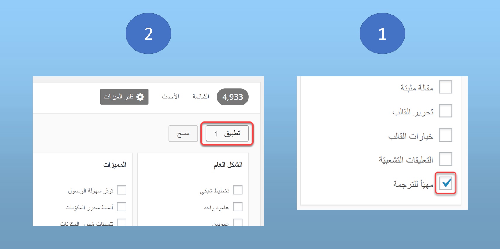 في القائمة التي تظهر ضع إشارة صح في المربع الموجود بجانب خيار (مهيأ للترجمة) الذي ستجده في الغالب في نهاية قائمة خيارات (المميزات)، ثم انقر على زر (تطبيق) الموجود تحت أيقونة (فلتر الميزات) وإلى اليمين قليلًا، وذلك من أجل فلترة القوالب وإظهار القوالب الجاهزة للترجمة فقط في الصفحة.