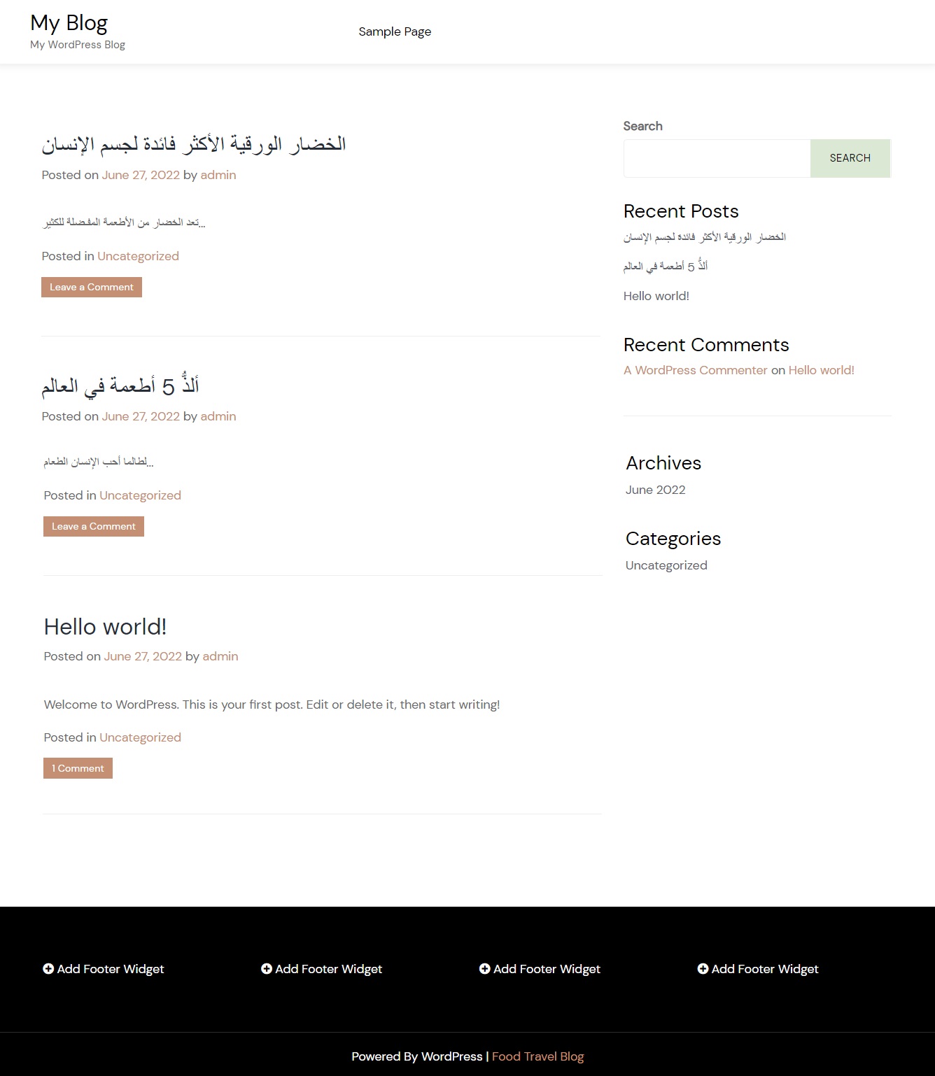 سنشرح هناك بشكل عملي كيفية تعريب قالب Food Travel Blog، وهو قالب كُتب ضمن وصفه في موقع الووردبريس الرسمي أنه مهيئ للترجمة، لكنه في الحقيقة لا يتضمن ملف POT، وبالتالي فهو فعليًا ليس مهيأ للترجمة، ولم يتم ذكر أنه يدعم ميزة RTL، لكنه في الحقيقية يدعمها بشكل جزئي.