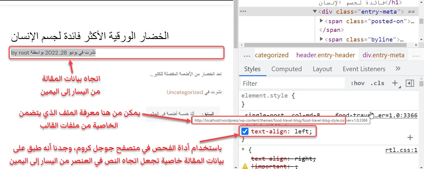 مع ذلك عند فتح صفحة المقالة، لاحظنا أن محاذاة عنوان المقالة وبياناتها كانا إلى اليسار وليس إلى اليمين، وهذا يشير إلى أنه قد طُبِّق على تلك العناصر خصائص فيزيائية جعلتها تتجه إلى اليسار بدلًا من اليمين مثل (text-align:left). لمعرفة ذلك، قمنا باستخدام أداة الفحص (Inspect) في جوجل كروم، وعرفنا أن هناك قواعد CSS بالفعل مطبقة على هذين العنصرين جعلتهما يتجهان إلى اليسار.