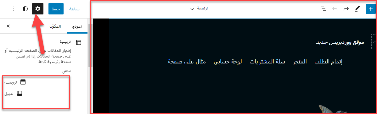 عند الدخول إلى تبويب الإعدادات على يسار صفحة تحرير الموقع كما هو موضع بالصورة، سيفتح أمامنا تبويب يحتوي على عنصرين رئيسيين وهما ( الترويسة، وتذييل):