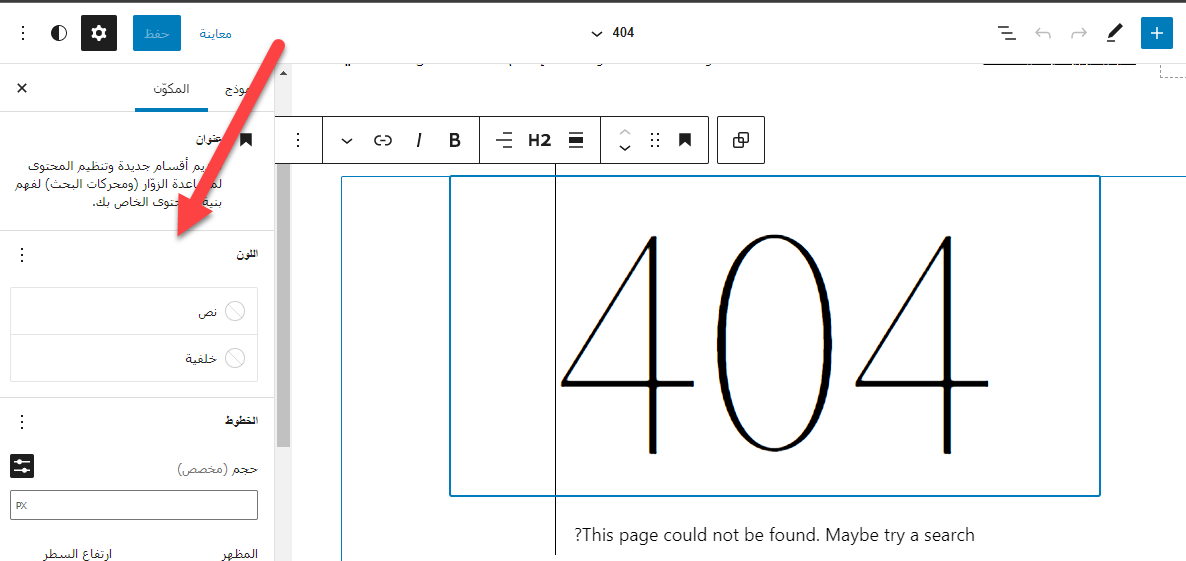 كما تلاحظ، فإن كافة العناصر والمكونات الخاصة بصفحة الخطأ 404 تظهر أمامك كعناصر قابلة للنقر والتحرير، وهو ما يسهل عليك النقر على أي عنصر داخل الصفحة والتوجه إلى تبويب المكون لتخصيص المظهر الخاص بالعنصر مثل تعديل الألوان والخلفيات والأحجام وغيرها من خصائص التصميم.
