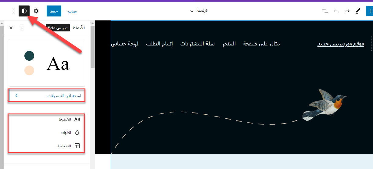 يمكنك الدخول إلى لوحة التنسيقات العامة للقالب من خلال الأيقونة المخصصة لها أعلى يسار صفحة محرر القالب، والتي تفتح لوحة تحتوي على تبويب (استعراض التنسيقات)، وتبويب خاص بتنسيقات الخطوط والألوان والتخطيط العام للموقع.